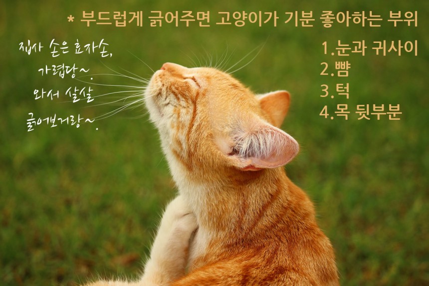영국 링컨대 사라 엘리스 박사가 이끈 연구팀도 신체 어느 부위를 쓰다듬어 줬을 때 고양이가 좋아하는지를 실험을 통해 밝힌 바 있습니다. 생후 6개월부터 12세까지의 34 마리의 고양이를 대상으로 부위별 쓰다듬기를 실행했는데요. 그 결과 턱과 뺨, 눈과 귀 사이를 만져주면 가장 좋아했고 꼬리 쪽으로 갈수록 만지는 것을 싫어하는 것으로 나타났습니다.